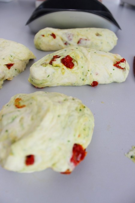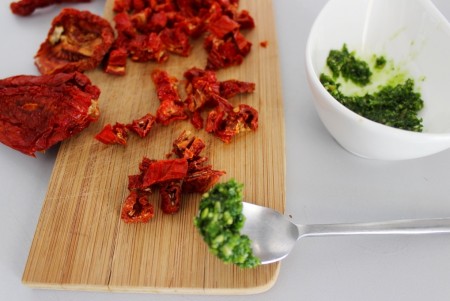 AJOUT DES TOMATES ET DU PESTO - Découper les tomates en petits dés. Au premier bip sonore, ouvrir la MAP et ajouter les tomates ainsi que le pesto. Laisser la MAP pétrir à nouveau la pâte et la faire pousser jusqu'au prochain bip sonore.